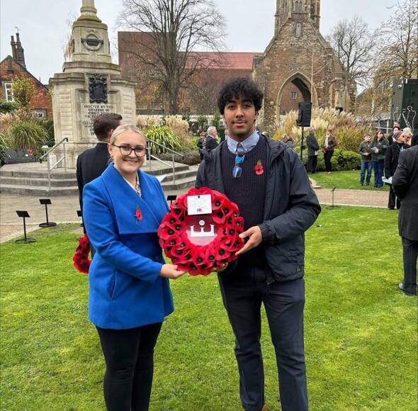 Youngest pupil, Issac Rudd, escorted by Head Students, Elosie Chaplin and Josh Johnson laid a wreath in the Great Hall as a symbolic gesture of remembrance and respect.